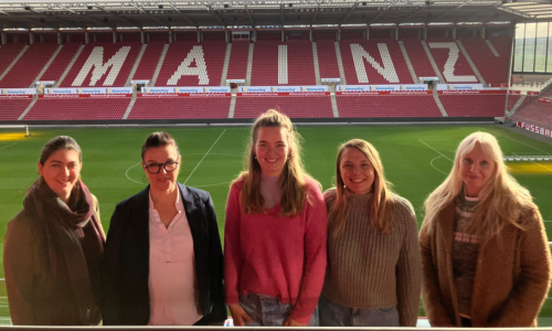 Auf dem Bild zu sehen, v.l.n.r., Birgit Kita (SchUM Städte e.V.), Anna Konrad (IB Südwest gGmbH), Milena Kropp (IB Südwest gGmbH) und Ciara Widmann (Mainz 05) auf der Abschlussveranstaltung des Projektes in der MEWA Arena.